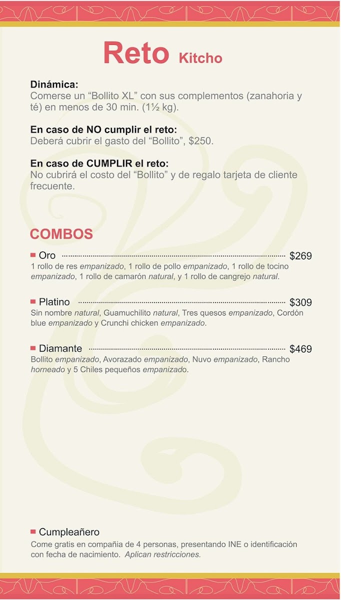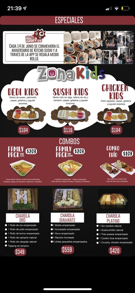 Located in Miguel Hidalgo, Culiacan Rosales, Kitcho Sushi offers a menu focused primarily on sushi and related Japanese cuisine. The menu presents a selection of sushi options, including various types of rolls and sashimi, complemented by other Japanese dishes that fit well for light meals or casual dining occasions.